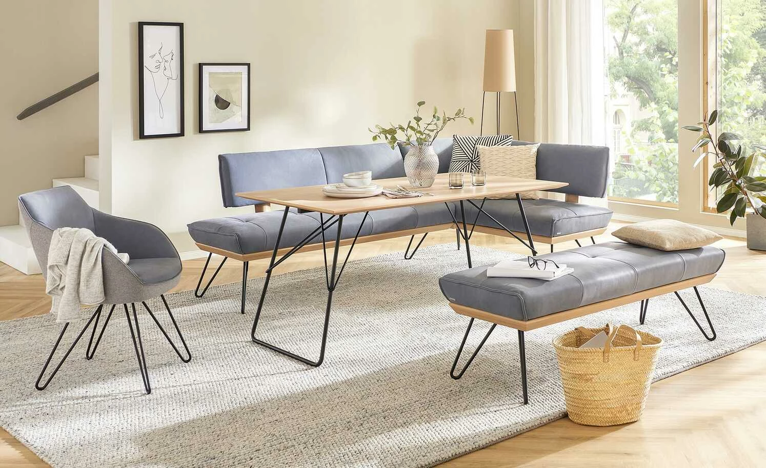 - Mehr zum Material: Platte in Wildeiche bianco furniert (UV-beschichtet mit Öl-Effekt), Drahtgestell aus Metall pulverbeschichtet strukturiert