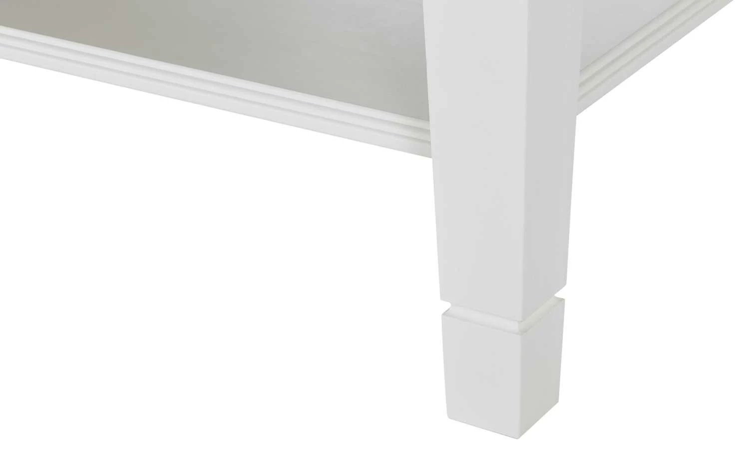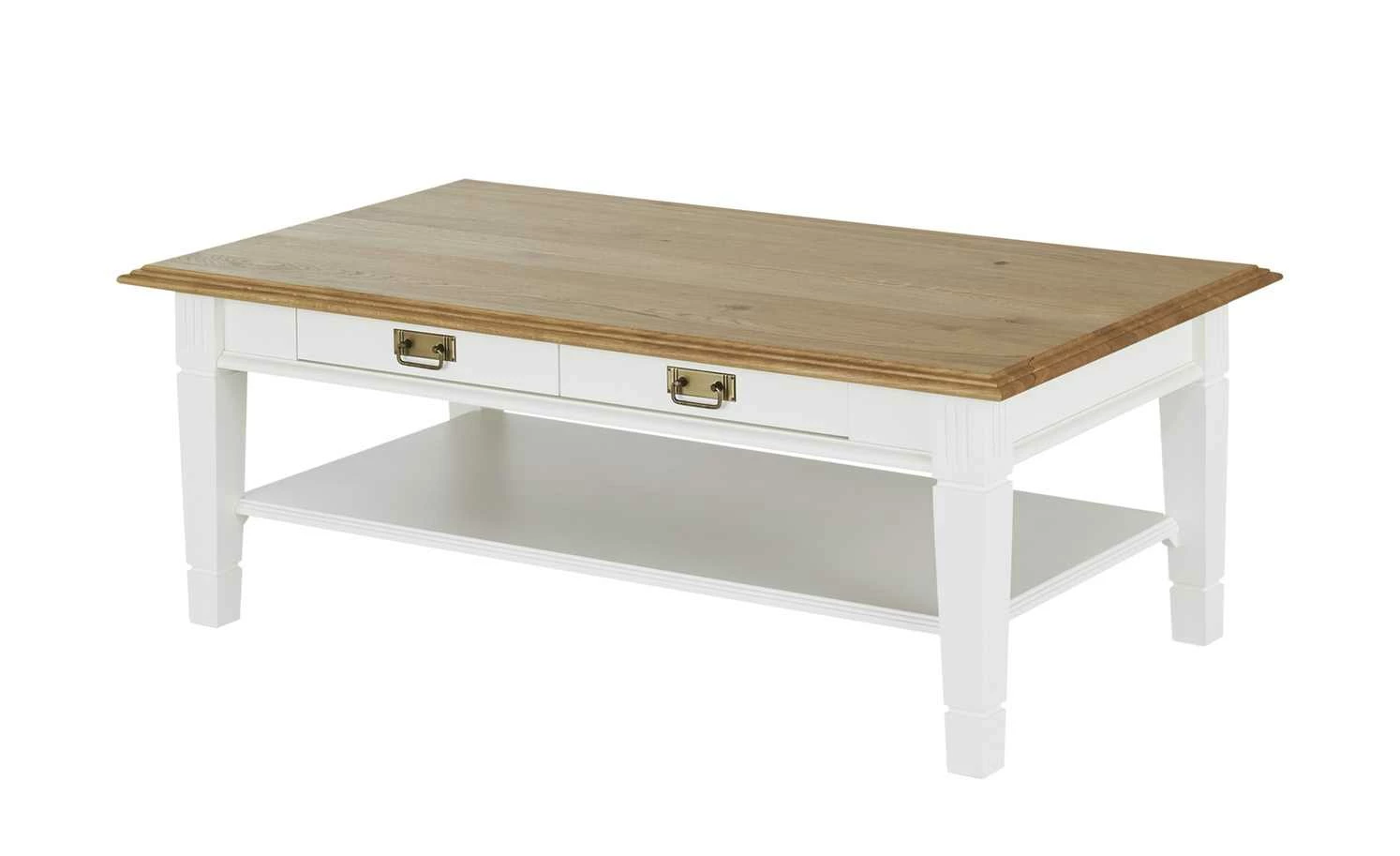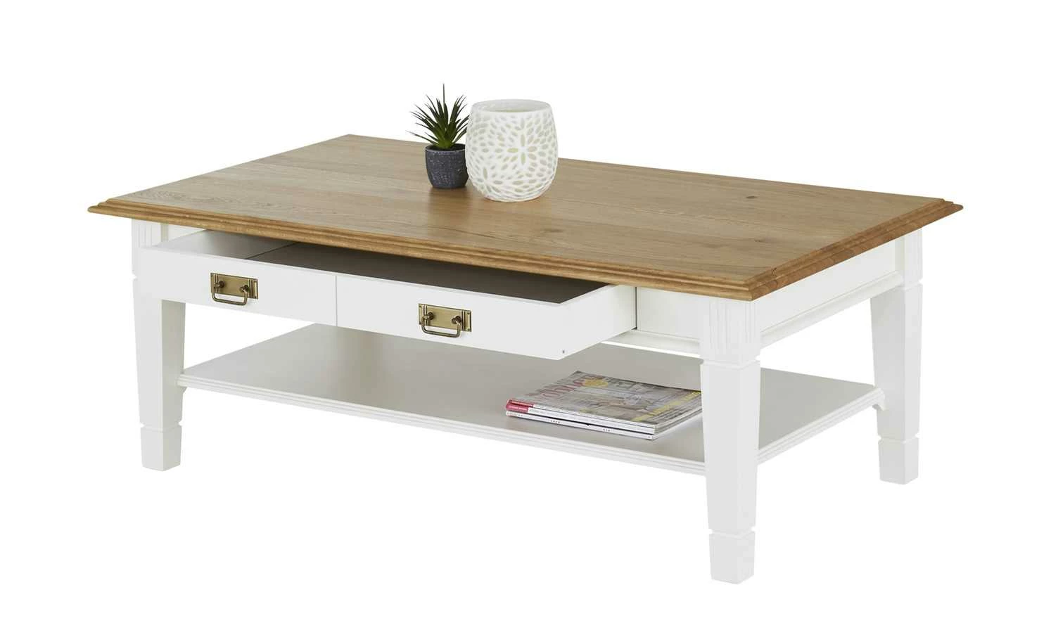Wer seinen Wohnraum einheitlich im Landhausstil gestalten möchte, der braucht auch den passenden Couchtisch. Der Tisch Lina von maison bleue greift den Landhaus-Look der anderen Möbel auf. Lina ist ebenso dekorativ verziert. Während die Tischplatte ein natürliches Dekor in Wildeiche Natur hat, setzt sich das Gestell in Reinweiß ab. Gestell und Tischplatte sind beide aus Massivholz: das Gestell aus Polarkiefer, die Tischplatte aus Wildeiche. Unterhalb dieser steht Ihnen eine große Schublade zur Verfügung. Sie können sie von beiden Seiten öffnen. Des Weiteren bietet Lina eine zusätzliche Ablage.