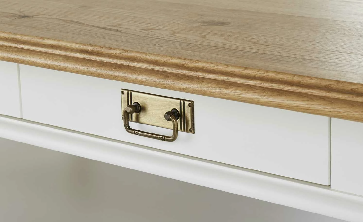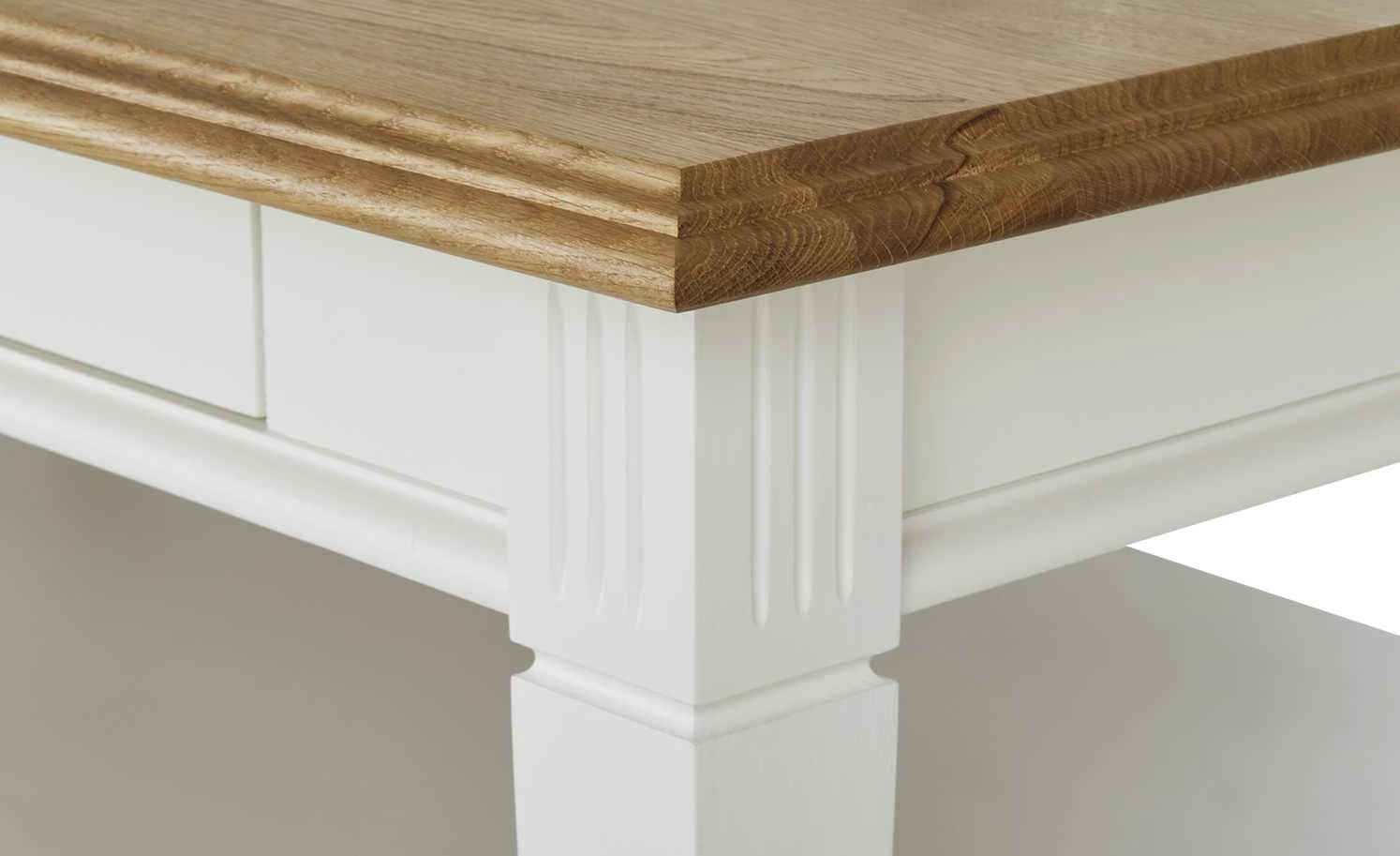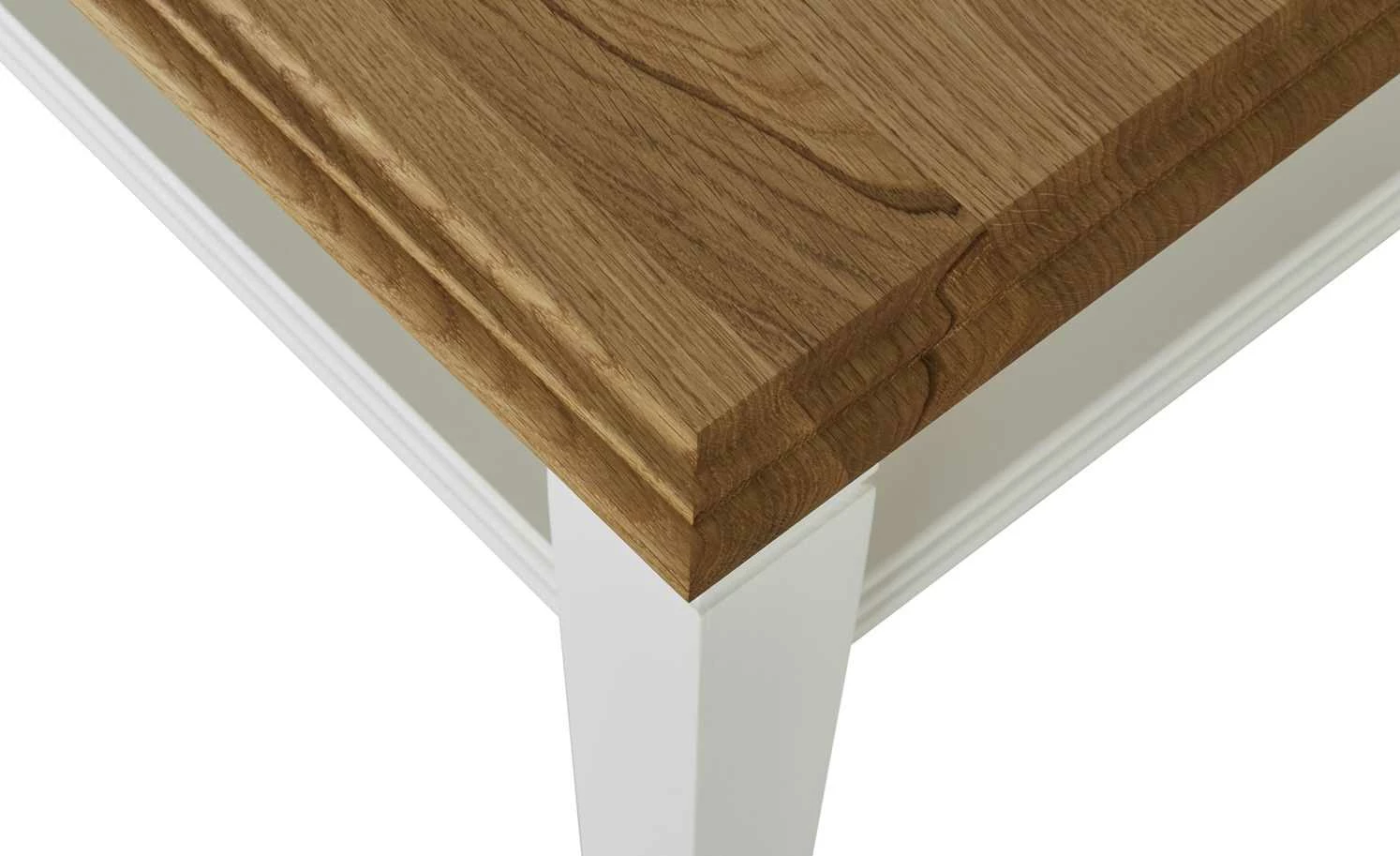 - Mehr zum Material: Gestell und Korpus aus nordischer Polarkiefer massiv Reinweiß lackiert, Tischplatte aus Wildeiche natur massiv geölt