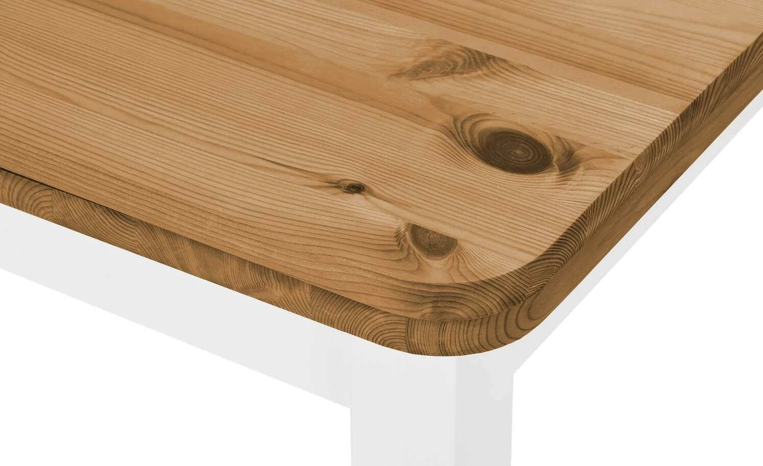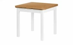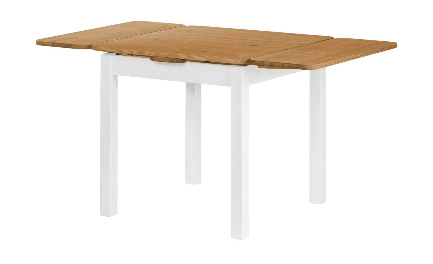 Der Esstisch ist in Kiefer massiv gefertigt. Das Gestell ist weiß lackiert und die Platte laugenfarbig, was den Landhausstil unterstreicht. Aufgrund seiner Größe ist er ideal für kleine Räumlichkeiten. Durch die beiden Ausziehplatten mit jeweils 25 cm, kann die Fläche des Tisches für ca. 6 Personen erweitert werden.