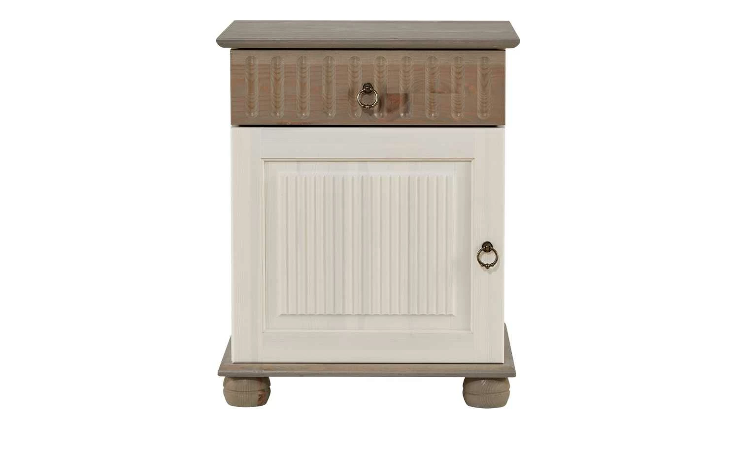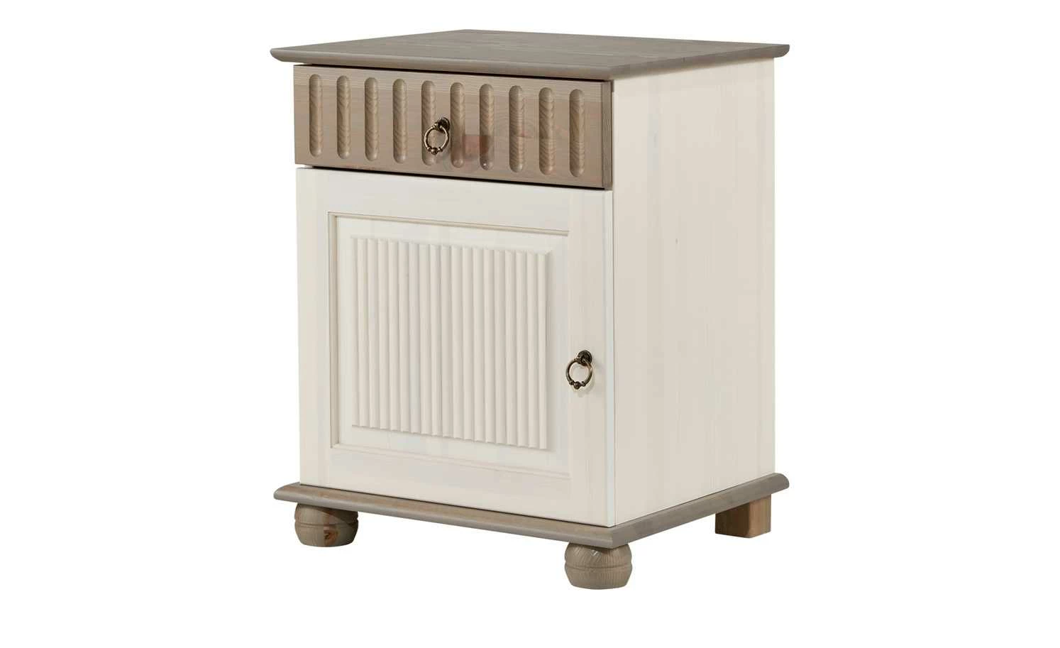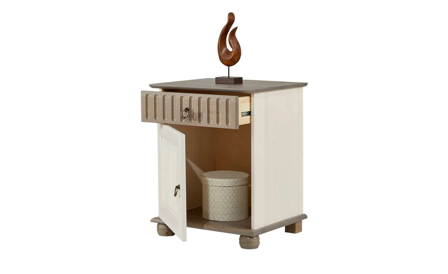 Diese kleine Nachtkommode ist nicht nur praktisch, sondern bereichert Ihr Schlafzimmer auch dekorativ. Bornholm hat ein rustikales Landhaus-Design. Passend dazu ist die Farbgestaltung in Kiefer Weiß und Kiefer lavafarben. Die Nachkommode besteht aus massivem Kiefernholz – die Oberfläche ist gewachst und lackiert. Im Inneren bietet die praktische Nachtkommode ausreichend Platz für alles, was Sie neben Ihrem Bett aufbewahren möchten. Oberhalb des geräumigen Faches mit Drehtür befindet sich eine Schublade. Die Zug-Griffe in Ringform aus Metall sind im Used-Look gehalten und sorgen neben ihrer Funktion auch für optische Highlights.
