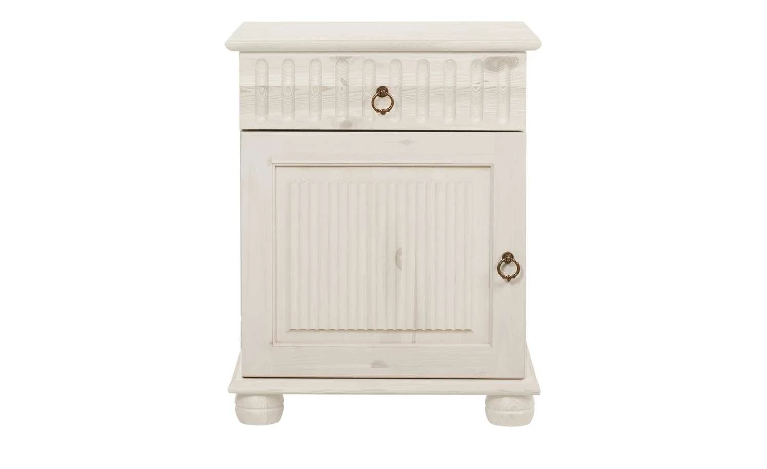 Diese optisch ansprechende Nachtkommode ist nicht nur praktisch, sondern bereichert Ihr Schlafzimmer auch dekorativ. Durch das rustikale Landhaus-Design und die Farbgestaltung passt der Nachtschrank ideal zum gleichnamigen Bettgestell der Serie Bornholm. Die Nachkommode besteht aus massivem Kiefernholz – die Oberfläche ist gewachst. Im Inneren bietet die praktische Nachtkommode ausreichend Platz für alles, was Sie neben Ihrem Bett aufbewahren möchten. Oberhalb des geräumigen Faches mit Drehtür befindet sich eine Schublade. Die Zug-Griffe in Ringform aus Metall sind im Used-Look gehalten und sorgen neben ihrer Funktion auch für optische Highlights.