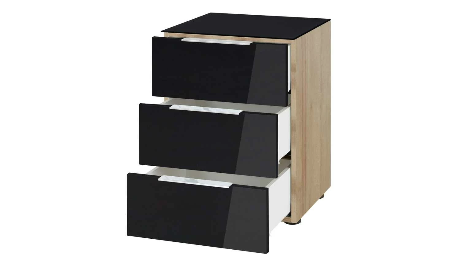 Mit ihrem stylischen Look ist die Nachtkommode Vitreo ein optisches und praktisches Highlight neben dem Bett. Ihnen stehen drei geräumige Schubladen zur Verfügung. Das geradlinige Design wird durch die angesagte Farbgebung unterstützt. Front und Abdeckplatte sind in Anthrazit gehalten, der Korpus setzt sich in Holzoptik ab. Alle anthrazitfarbigen Elemente haben eine Oberfläche aus ESG-Sicherheitsglas. Es ist besonders stabil und hat einen schönen Glanz, der das Weiß akzentuiert. Möbelgriffleisten im Chromlook setzen zusätzliche Akzente. Der Korpus ist mit Melamin beschichtet und deshalb kratzerunempfindlich. Vitreo ist hochwertig gearbeitet und mit dem Gütesiegel Made in Germany ausgestattet.