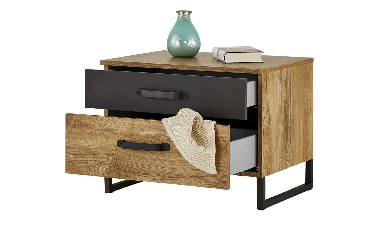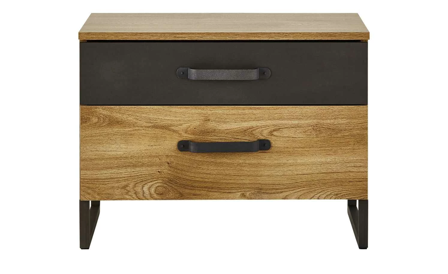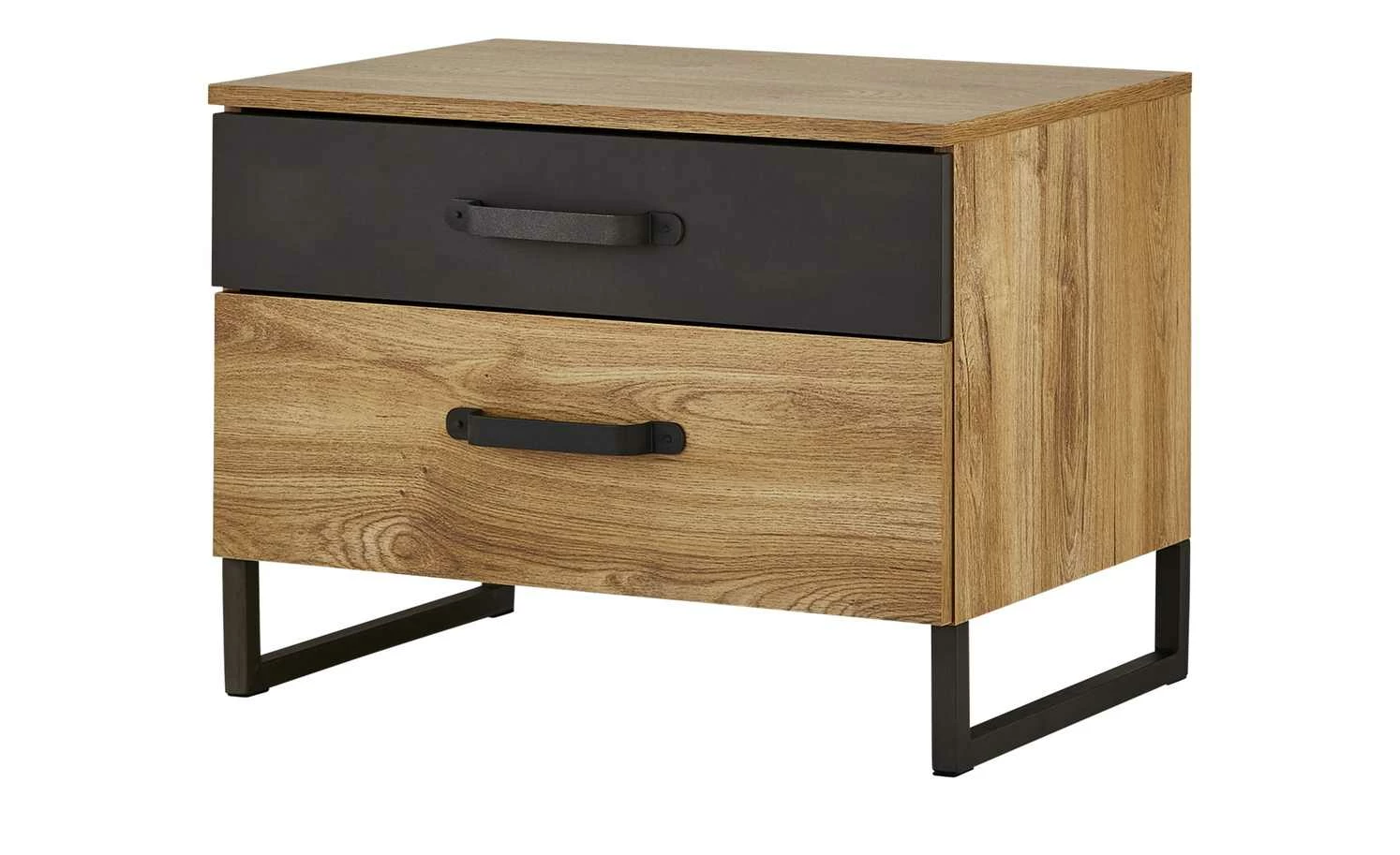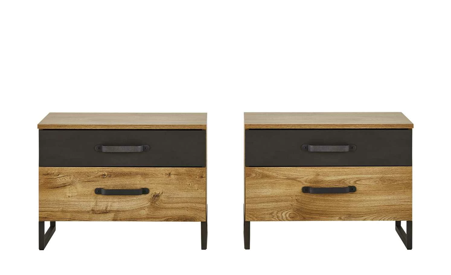 Mit den Nachtkommoden Durham können Sie das gleichnamige Doppelbett wunderbar ergänzen. Gleich zwei Kommoden sind im Lieferumfang enthalten, so dass eine links und die andere rechts vom Bett stehen kann. Auch optisch passen die Kommoden perfekt zur gleichnamigen Serie. Das Dekor in Plankeneiche (Nachbildung) wird durch eine dunkle Absetzung in Stahl (Nachbildung) kontrastiert. Passend dazu sind Kufengestell und Bügelgriffe aus schwarzem Metall. Durham ist mit jeweils zwei Schubladen ausgestattet.
