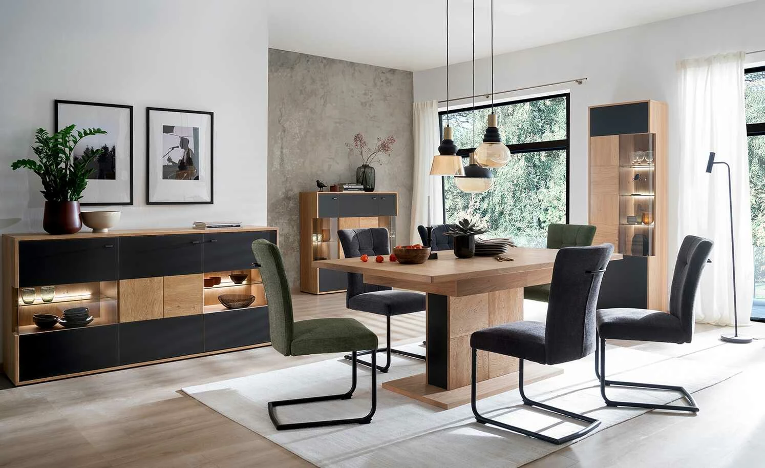 - Mehr zum Material: Bodenplatte: Eiche Bianco furniert und geölt, Tischsäulenabsetzung: Glas (Anthrazit) satiniert, Tischsäule: Balkeneiche Bianco massiv mit durchgehender Lamelle, strukturiert, sandgestrahlt und lackiert