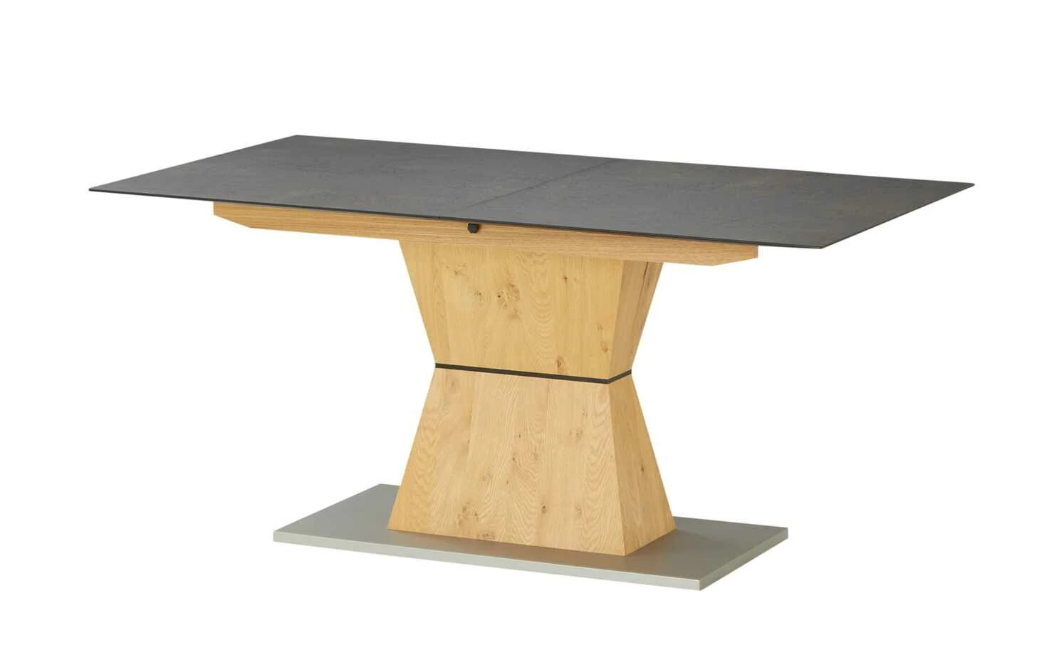 - Mehr zum Material: Bodenplatte lackiert in Edelstahl-Optik, Gestell: Charakter-Eiche furniert, Tischplatte aus HPL (High Pressure Laminate) in Granit-Design