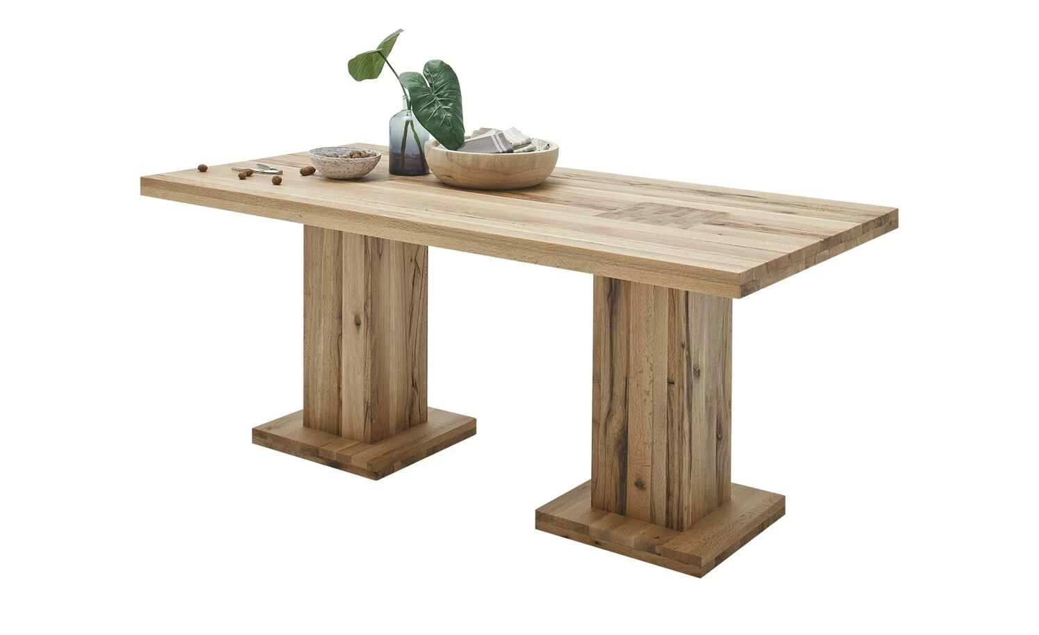 - Mehr zur Ausführung: Jeder Tisch ein Unikat. Risse, Druckstellen, Äste, Löcher und Farbunterschiede sind gewollt., Sichtbare Säulenabsetzung in der Tischplatte