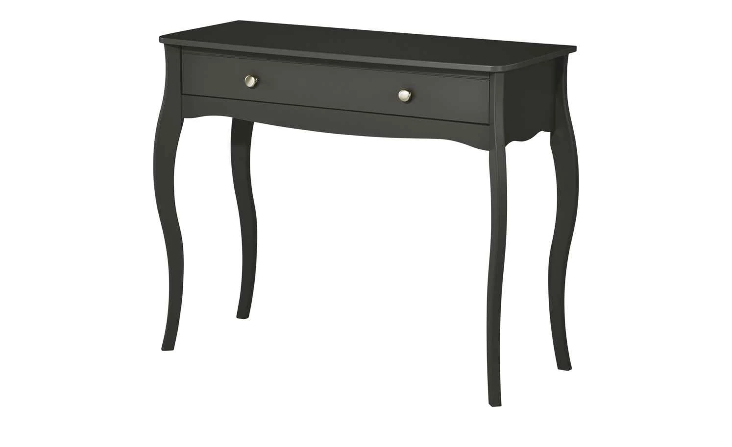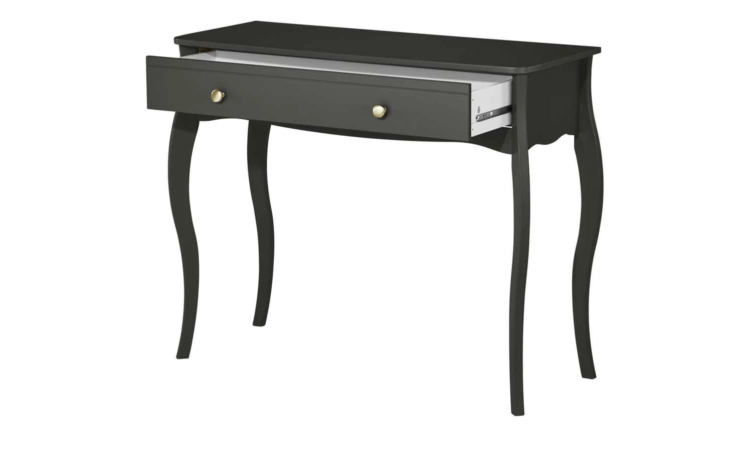 Zum Schminken und Frisieren braucht es einen passenden Platz. Genau der bietet sich mit dem Schminktisch Barbona. Die Tischplatte ist groß genug, um darauf Spiegel, Make-up und Parfüm abzustellen. Unter der Tischplatte befindet sich außerdem ein großes Schubfach, in dem Sie Pinsel, Puder und Co. verstauen können. Barbona ist komplett lackiert. Das moderne Schwarz harmoniert mit dem romantischen Gesamtlook des Schminktisches.