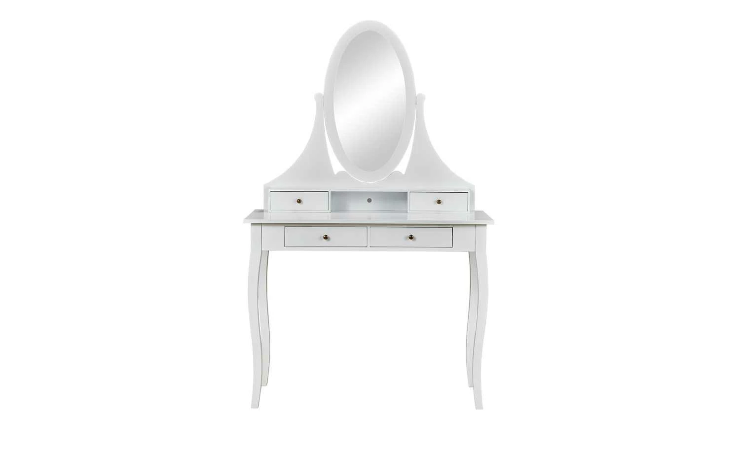 Zum alltäglichen Schminken und Frisieren ist der Schminktisch Mosi einfach ideal. Gleichzeitig bringt er einen romantisch-verspielten, glamourösen Look in das Schlafzimmer. Mosi ist komplett weiß lackiert. Der große mittige Spiegel lässt sich drehen, so dass Sie ihn beim Stylen auf sich ausrichten können. Mosi ist mit drei geräumigen Schubfächern ausgestattet. Auf der rechten Seite finden Sie außerdem eine Schublade für Kosmetiktücher. In der Abdeckplatte befindet sich genau darüber eine Öffnung, aus der Sie die Tücher einfach herausziehen können.