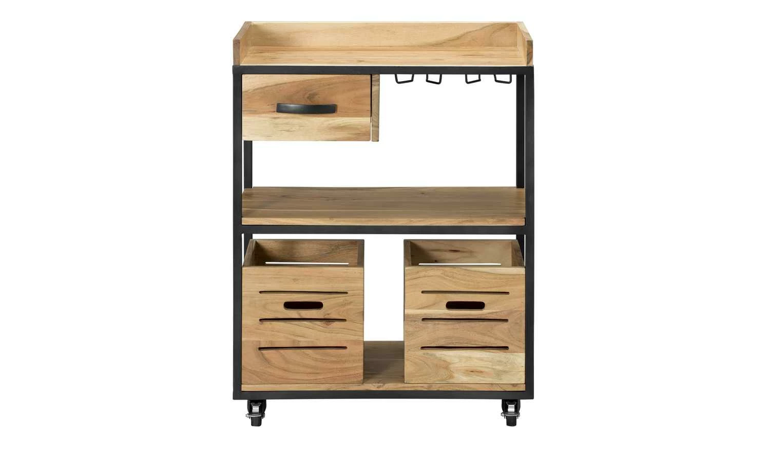 Der 94 cm hohe Servierwagen Muli hat ein durchdachtes Design und fällt durch seinen Materialmix sofort ins Auge. Das Gestell besteht aus schwarz lackiertem Metall. Dies steht im optischen Kontrast zu dem natürlichen Akazienholz. Auf drei Ebenen können Gegenstände, die in der Küche unerlässlich sind, platziert werden. Neben einer Schublade und zwei vielseitig einsetzbaren Mehrzweckboxen mit Griff gibt es noch zwei praktische Metallhalter. Hier lassen sich Gläser hängend befestigen, was noch mehr Stauraum schafft. Auf seinen Rollen befördern Sie den Servierwagen spielend leicht durch den Raum. Machen Sie sich das Leben damit einfacher – ein Eyecatcher ist der Servierwagen sowieso.