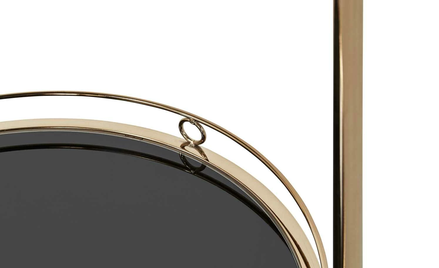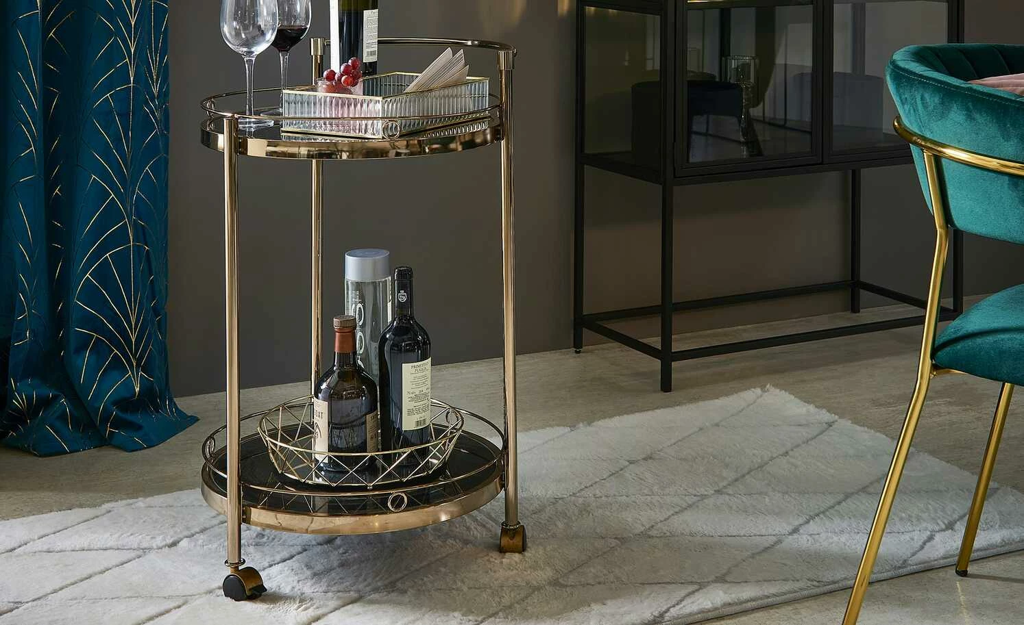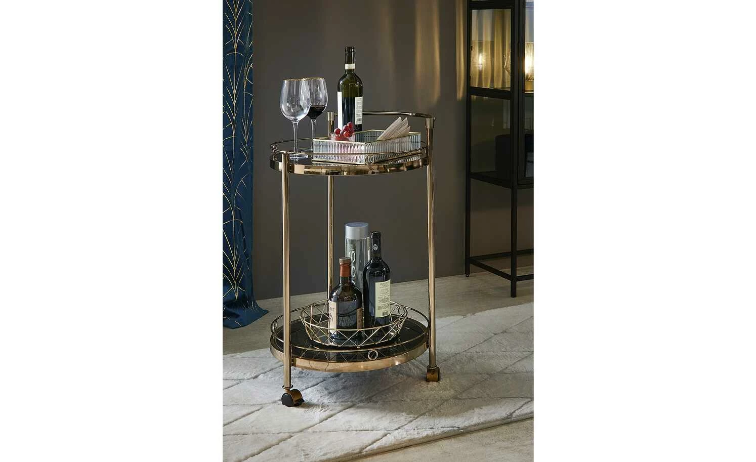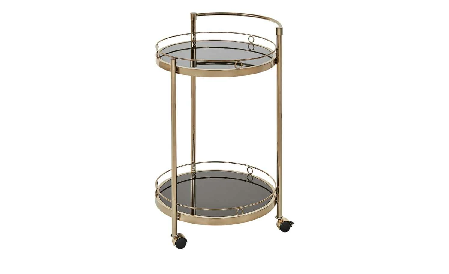 Den Servierwagen Oro können Sie zum Servieren, aber auch als Beistelltisch nutzen. Durch die drei Rollen lässt er sich leicht an den gewünschten Ort bewegen. Die beiden Ablagen haben einen Schutzrand, damit alles, was auf ihnen steht, auch wirklich sicher steht. Die Ablagen sind aus schwarzem Glas. Für das Gestell ist Metall verwendet worden. Es hat eine goldfarbene, galvanisierte Oberfläche.