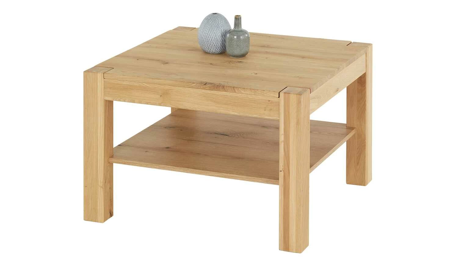 Der Couchtisch Oslo wirkt durch das verarbeitete Wildeichenholz natürlich und freundlich. Dadurch lässt er sich in zahlreiche Einrichtungsstile integrieren und kombinieren. Die 70 x 70 Zentimeter große Tischplatte wurde geölt und zeigt das Wildeichenholz von seiner besten Seite. Praktisch: Als zusätzliche Ablagemöglichkeit dient die Ablageplatte direkt unter der Tischplatte. Hier finden Zeitschriften und Co. Platz.