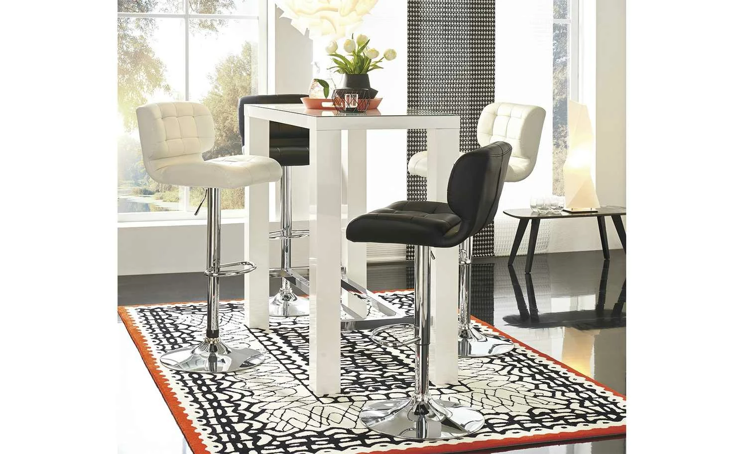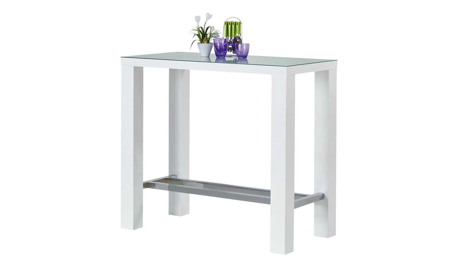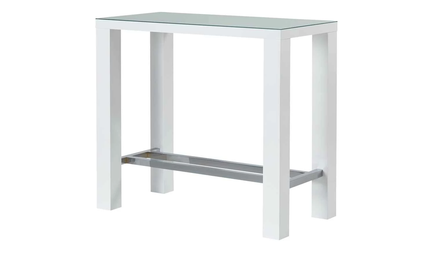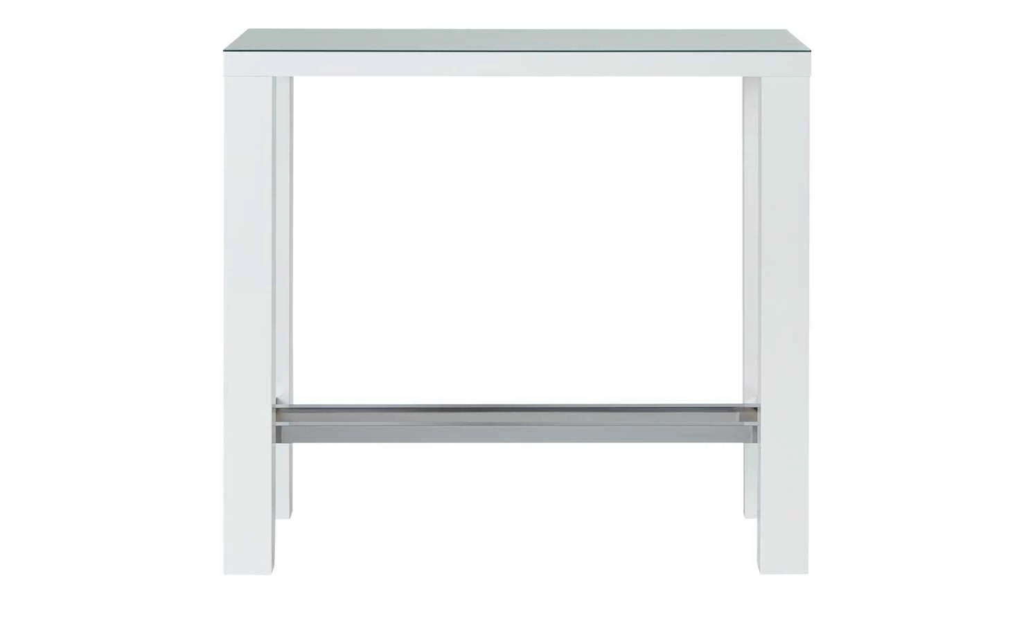 Der weiße Bartisch Jam ergänzt die Wohnzimmereinrichtung oder dient als zusätzlicher Tisch in der Küche. Er kann auch an die Wand geschoben und als Ablage genutzt werden. Der strahlend weiße Tisch besitzt eine eckige Grundform und vier Beine, die unten mit metallisch schimmernden Quer- und Längsstreben versehen sind. Auf der Oberseite befindet sich eine halbtransparente Tischplatte. So designt, verfügt der Tisch über ein modernes, abwechslungsreiches Aussehen.