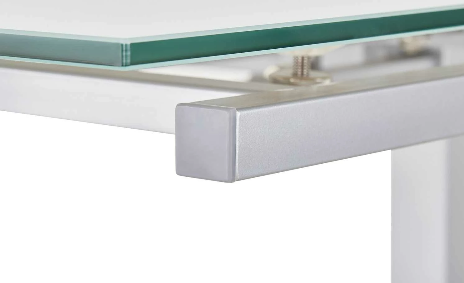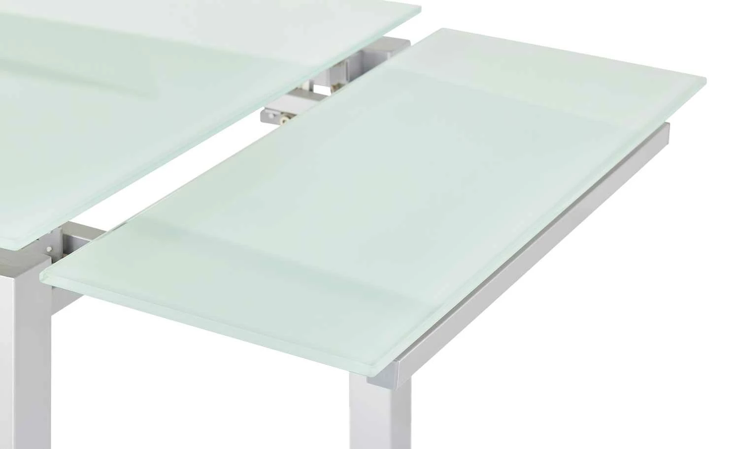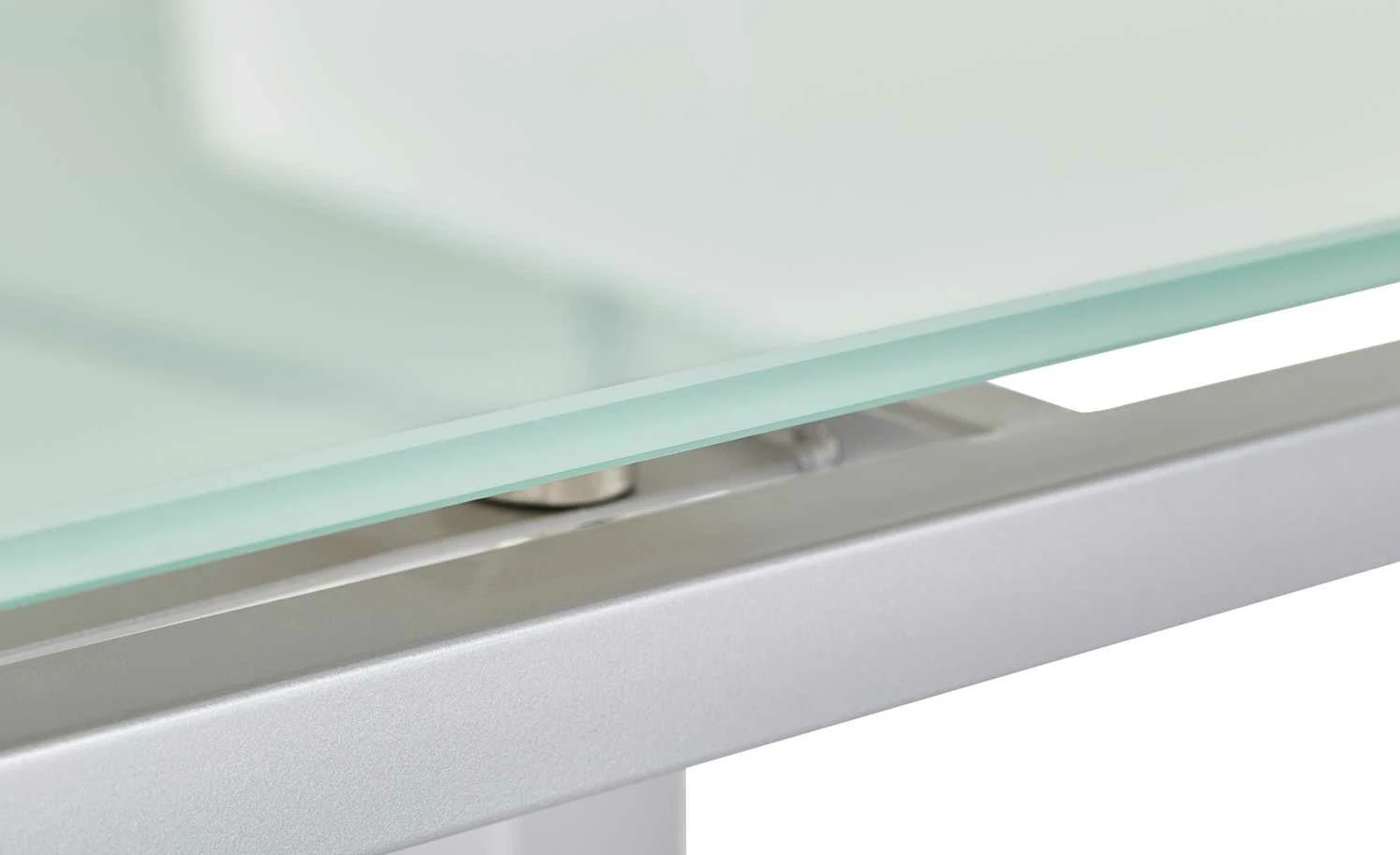Der Materialmix aus Glas und Metall lässt den Esstisch Tim modern und extravagant wirken. Das Gestell besteht aus Metall, welches alufarben lackiert wurde. Die Tischplatte besteht aus Glas. Das macht sie besonders pflegeleicht, denn Flecken lassen sich ganz einfach mit einem feuchten Tuch entfernen, ohne dauerhafte Spuren zu hinterlassen. Die Unterseite der Glasplatte ist weiß lackiert. Die Farbe schimmert durch das Glas hindurch, was eine besondere Optik entstehen lässt. Bei Bedarf können Sie Tim einfach auf zirka 170 Zentimeter verlängern. Möglich machen das die beiden sogenannten Vorkopfauszüge, die sich an den beiden Tischenden befinden.