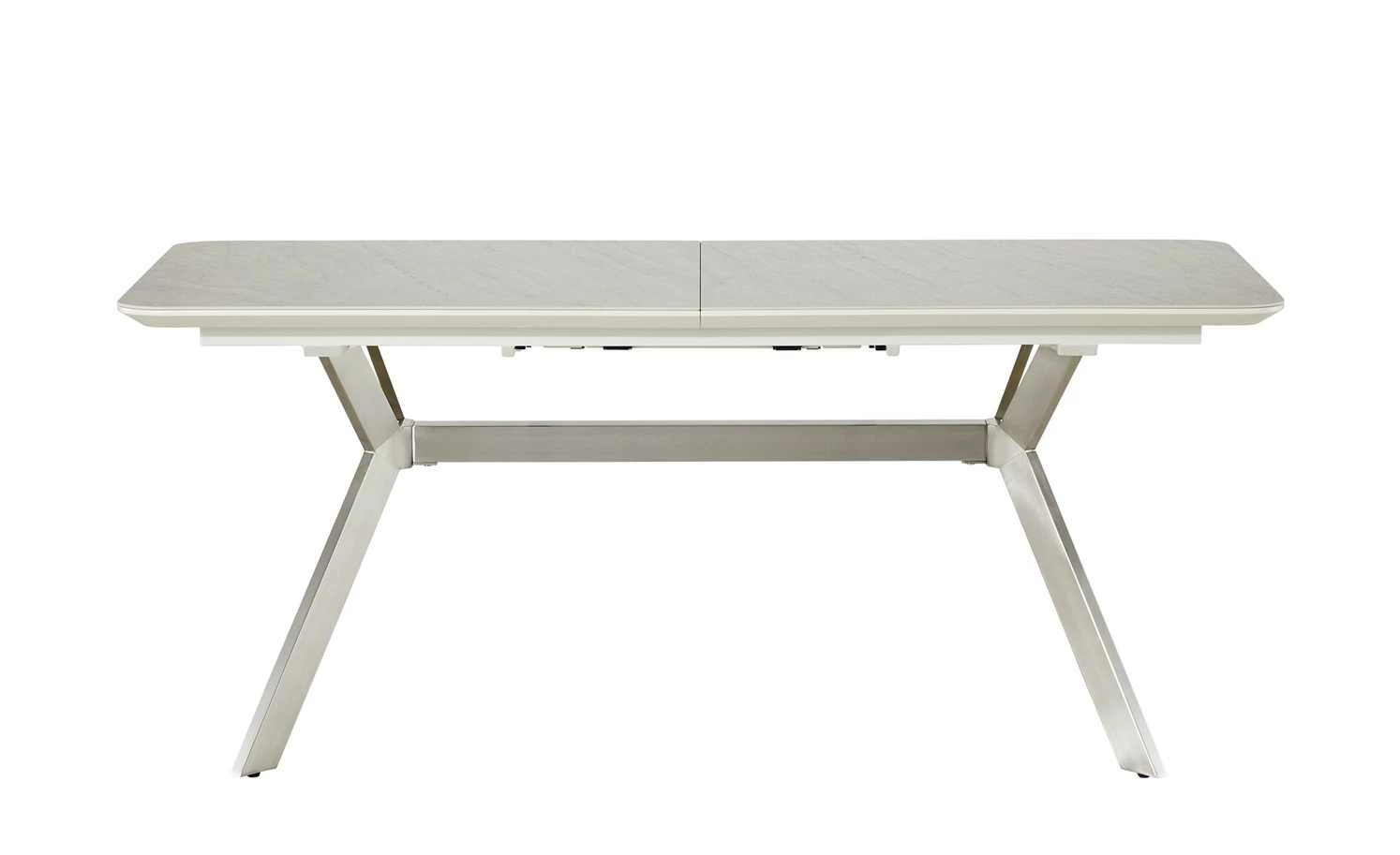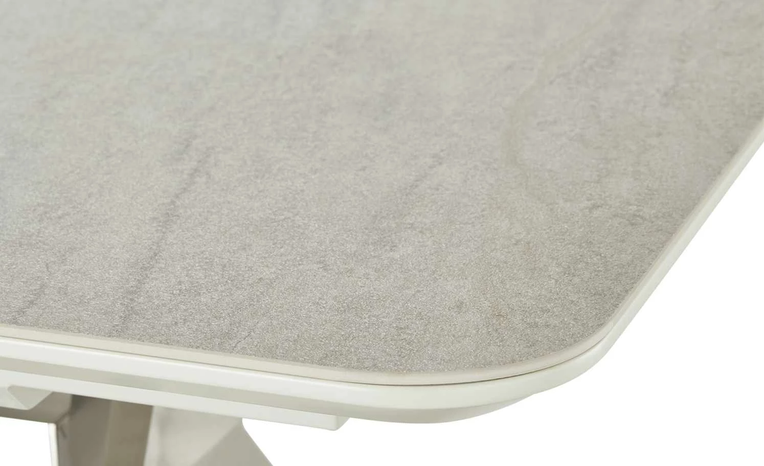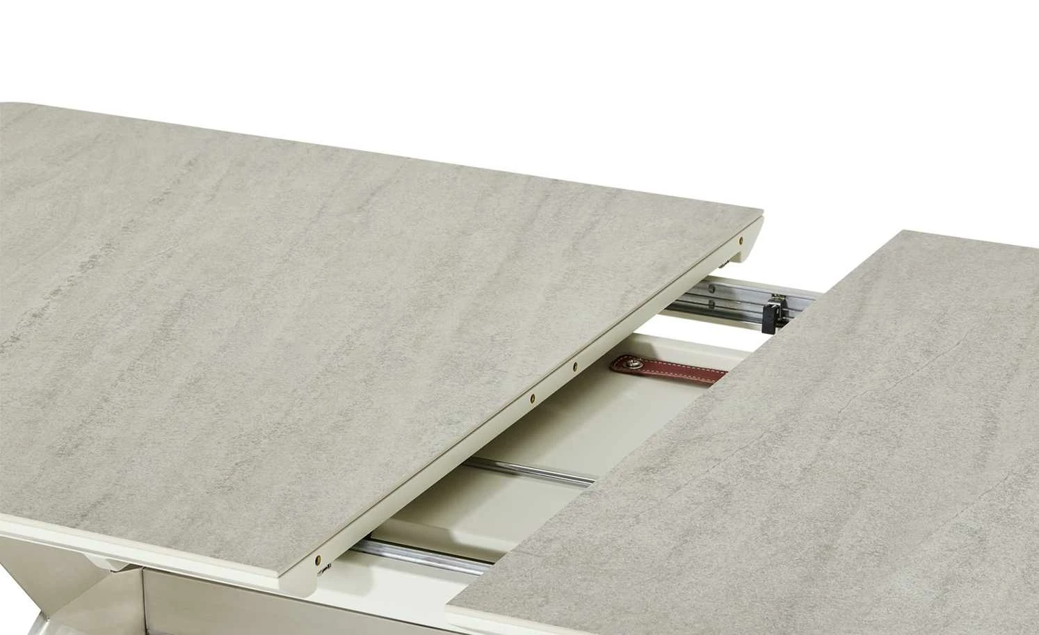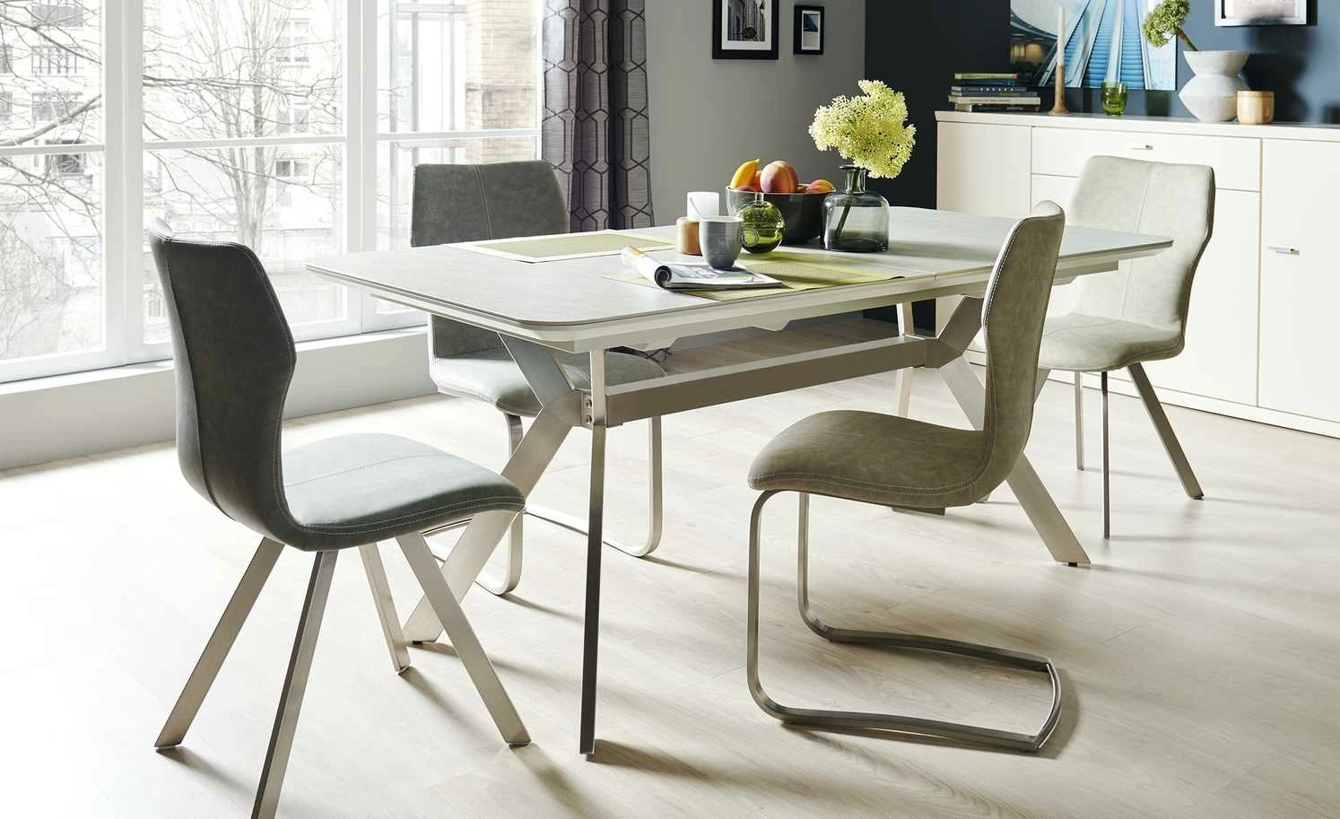 Die Tischplatte des Esstischs Derek besteht aus hochwertiger Keramik. Die Oberfläche ist matt lackiert und besticht durch ihre außergewöhnliche Struktur. Die Platte liegt auf einem stabilen Tischgestell aus gebürstetem Metall. Dank des Mittelauszuges können Sie Derek mit wenigen Handgriffen vergrößern.