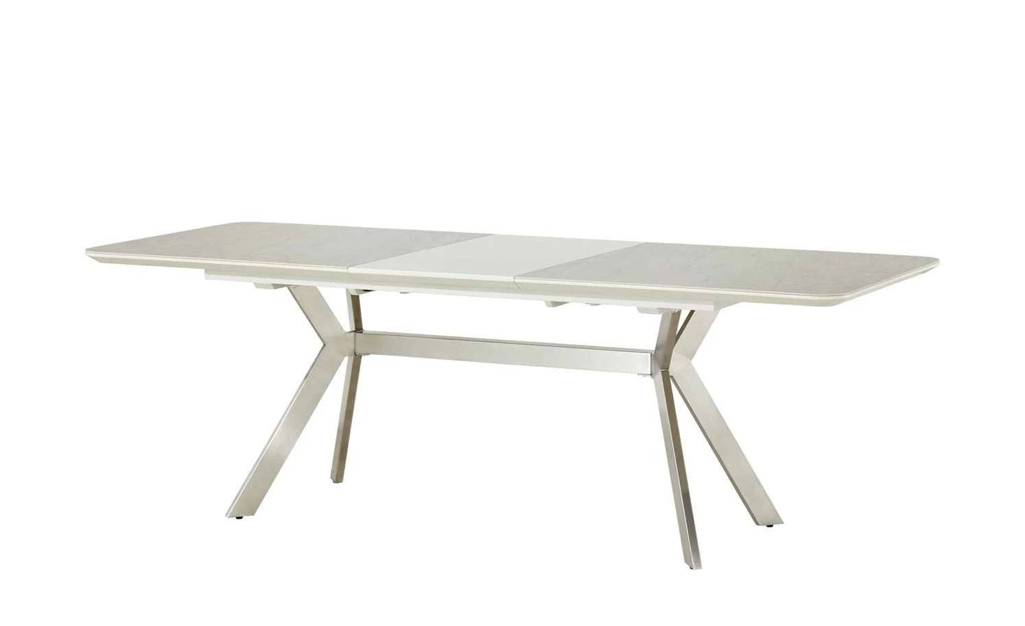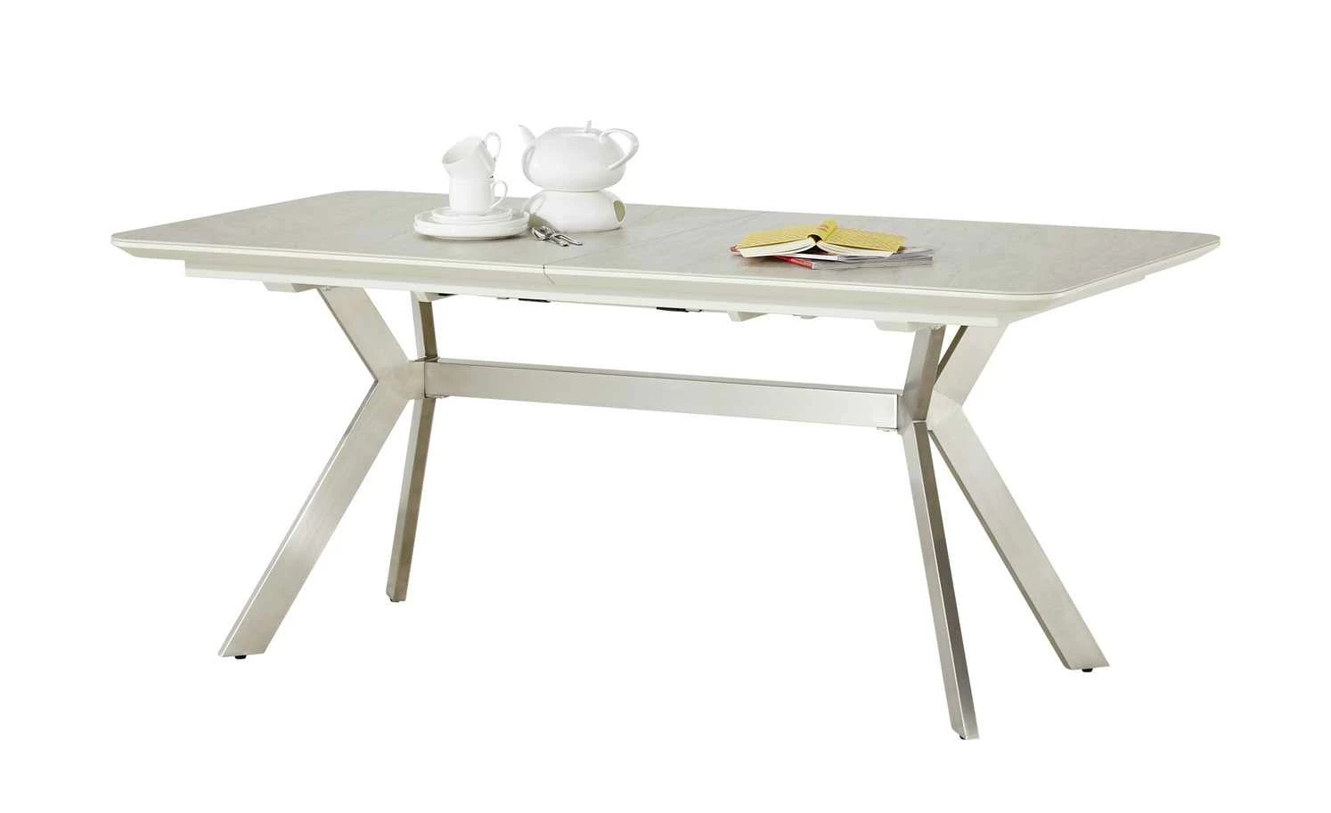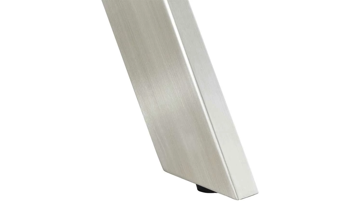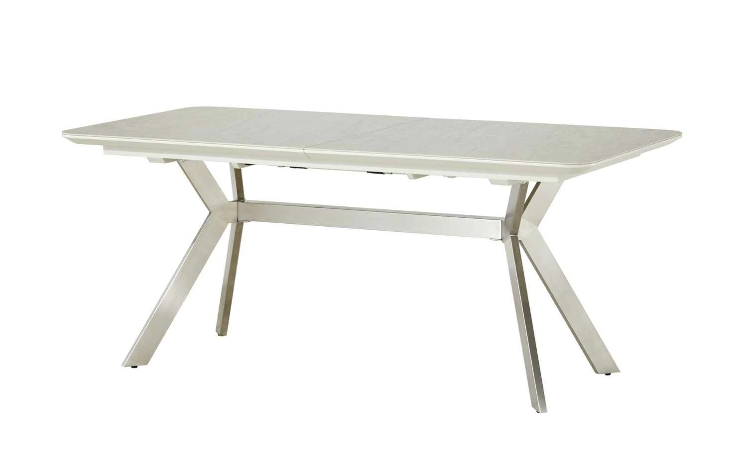 Die Tischplatte des Esstischs Derek besteht aus hochwertiger Keramik. Die Oberfläche ist matt lackiert und besticht durch ihre außergewöhnliche Struktur. Die Platte liegt auf einem stabilen Tischgestell aus gebürstetem Metall. Dank des Mittelauszuges können Sie Derek mit wenigen Handgriffen vergrößern.