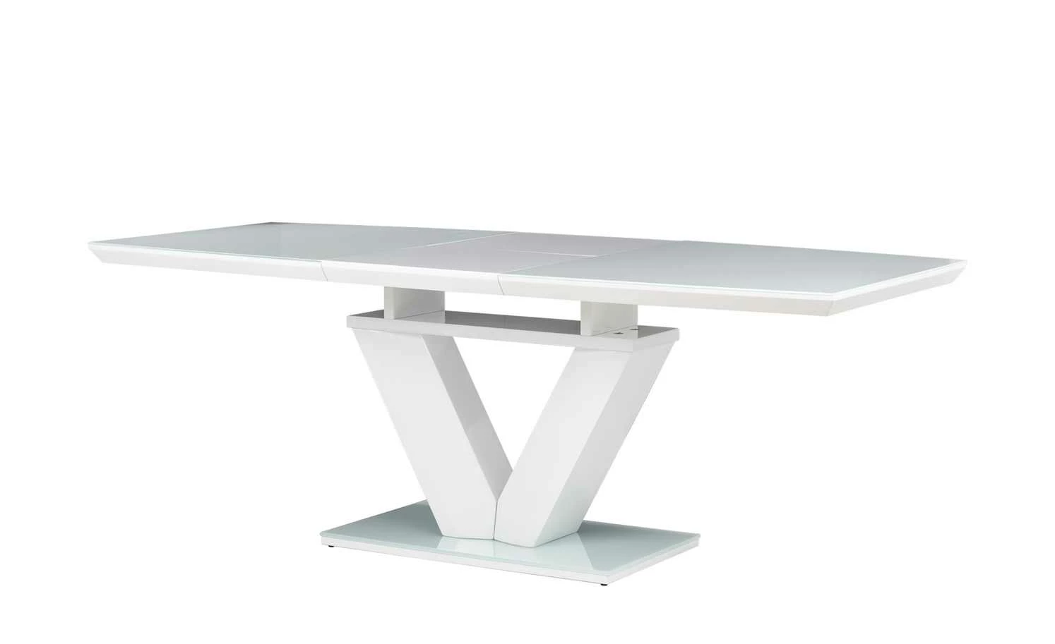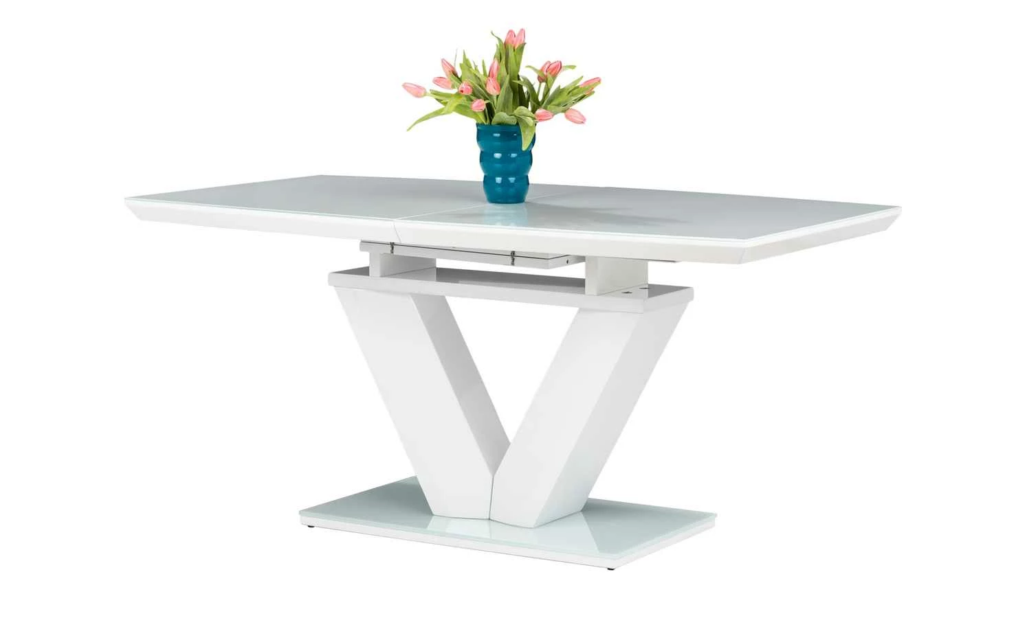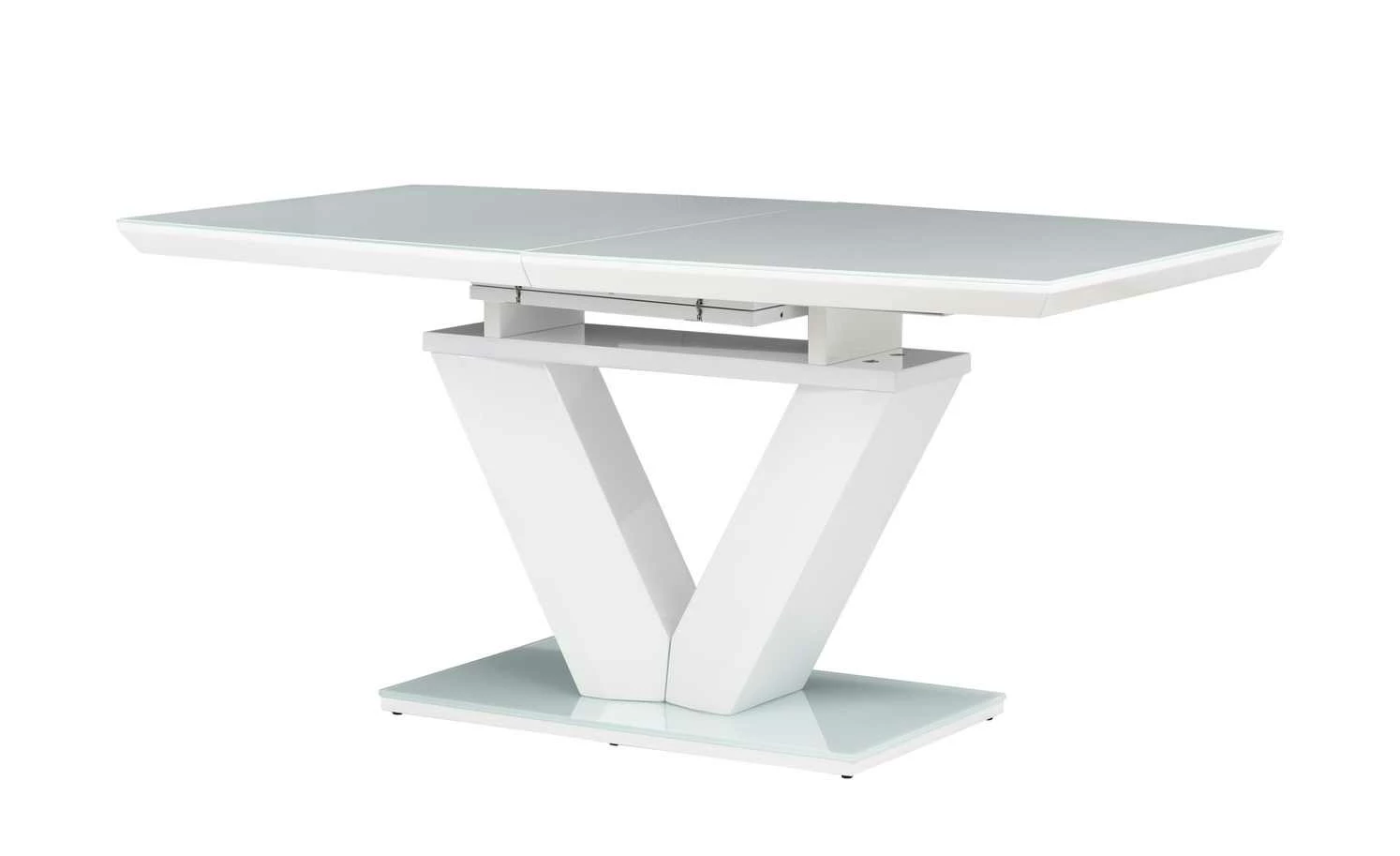 Der Esstisch Balian von uno überzeugt mit elegantem Aussehen und Funktionalität. Er verfügt über einen Mittelauszug, der die Tischplatte von 160 auf 210 Zentimeter verlängert. Je nach Länge können so sechs bis acht Personen an dem Tisch sitzen. Balian ist komplett in hochglänzendem Weiß designt. Die pure Farbe stellt einen Kontrast zum extravaganten Gestell dar. Die Tischplatte und der Fuß des Tisches sind von einer Glasfläche abgedeckt, welche gut mit der hochglänzenden Oberfläche harmoniert. Zudem ist das Glas vor allem bei der Tischplatte auch praktisch, denn sie kann so leicht abgewischt werden. Die Formgebung und weiße Optik des Tisches passen besonders zu modernen Einrichtungsstilen.