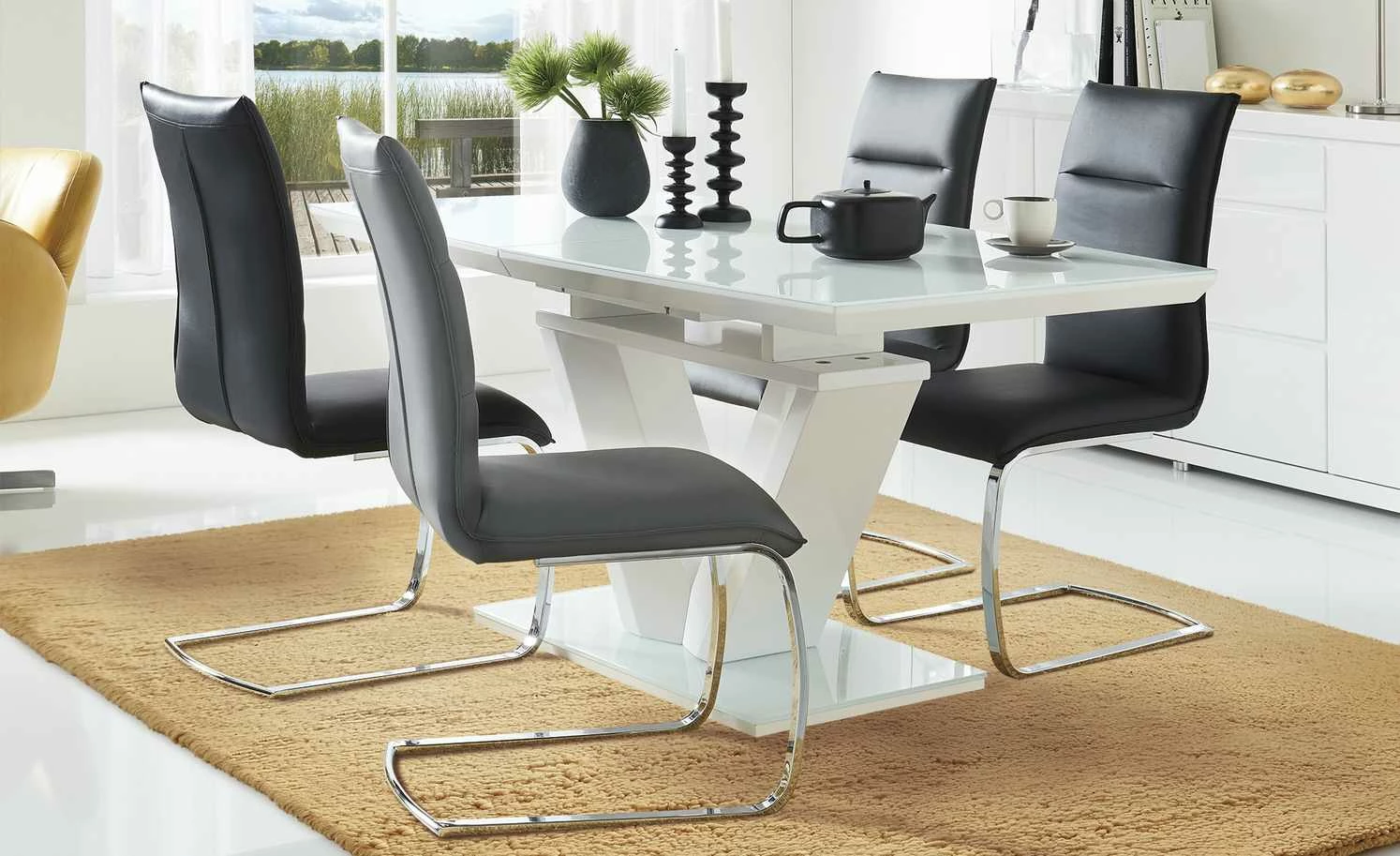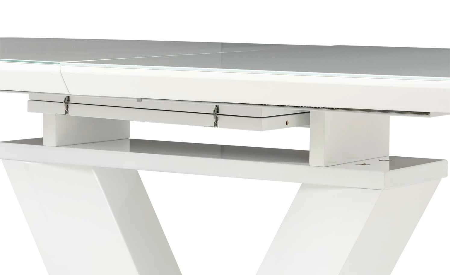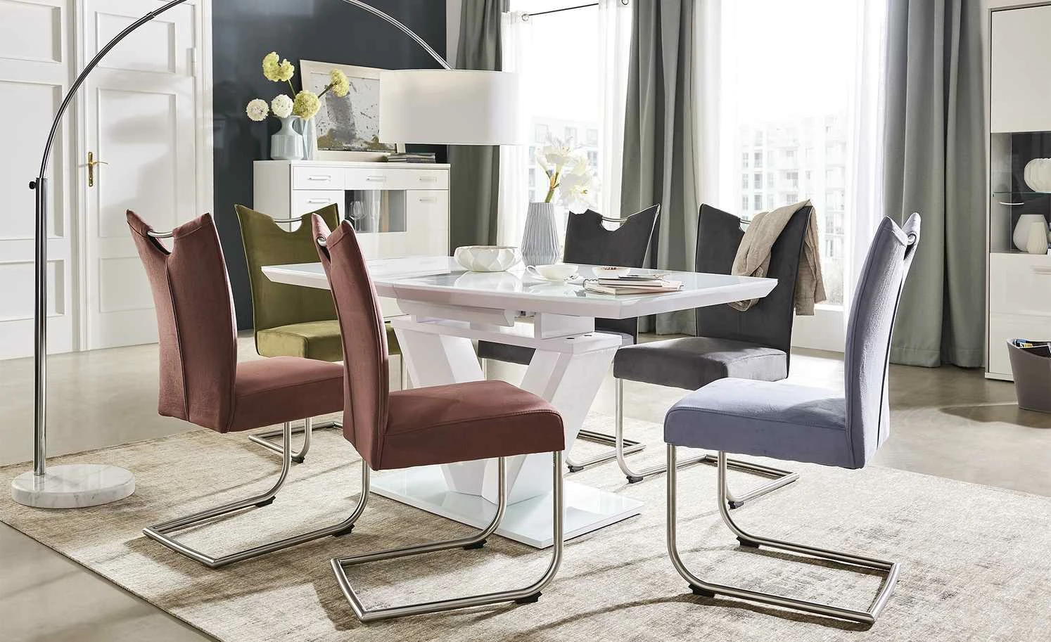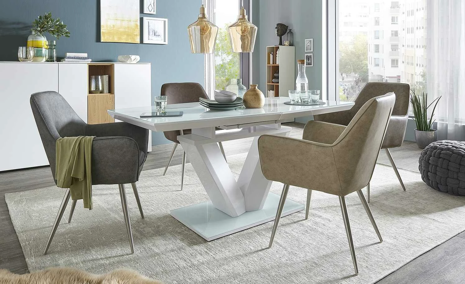 Der Esstisch Balian von uno überzeugt mit elegantem Aussehen und Funktionalität. Er verfügt über einen Mittelauszug, der die Tischplatte von 160 auf 210 Zentimeter verlängert. Je nach Länge können so sechs bis acht Personen an dem Tisch sitzen. Balian ist komplett in hochglänzendem Weiß designt. Die pure Farbe stellt einen Kontrast zum extravaganten Gestell dar. Die Tischplatte und der Fuß des Tisches sind von einer Glasfläche abgedeckt, welche gut mit der hochglänzenden Oberfläche harmoniert. Zudem ist das Glas vor allem bei der Tischplatte auch praktisch, denn sie kann so leicht abgewischt werden. Die Formgebung und weiße Optik des Tisches passen besonders zu modernen Einrichtungsstilen.