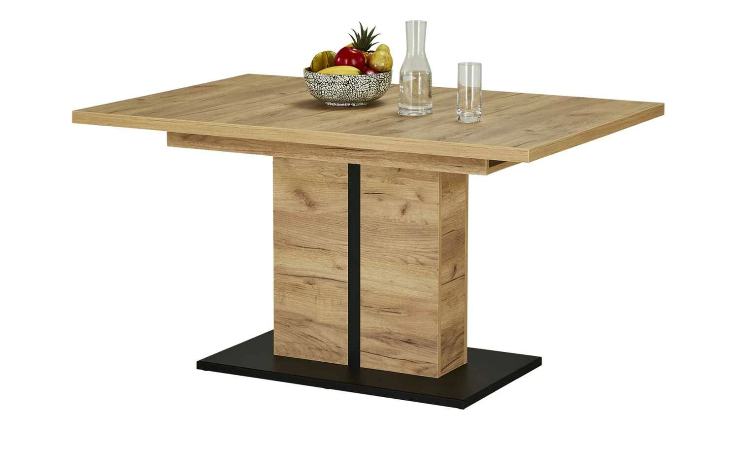 Der Esstisch Mona von uno fällt durch sein rustikales Dekor auf. Die Struktureiche Terra (Nachbildung) verfügt über Farbverläufe, angedeutete Risse und Asteinschlüsse. Säulengestell und Bodenplatte sind mit schwarzem Metall abgesetzt, was für tolle Akzente sorgt. Sie können die rechteckige Tischplatte durch einen Schiebeplattenauszug verlängern. Etwa sechs bis acht Personen können an dem Tisch Platz nehmen.