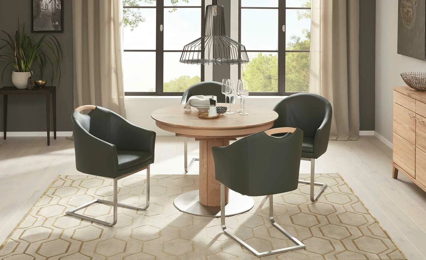 Beim Esstisch Der Runde von Wohnwert ist der Name Programm. Er verfügt über eine große runde Tischplatte. Sie kann aber mit wenigen Handgriffen länglich werden. Möglich wird das durch den praktischen Mittelauszug mit 40 bzw. 45 Zentimeter Klappeinlage. Etwa vier bis sechs Personen können an dem Tisch Platznehmen. Tischplatte und Gestell bestehen aus Eiche Bianco, die mit einem Wachseffektlack behandelt wurde. Die Bodenplatte aus Edelstahl setzt Akzente und sorgt – zusammen mit dem Säulengestell – für einen guten Stand.