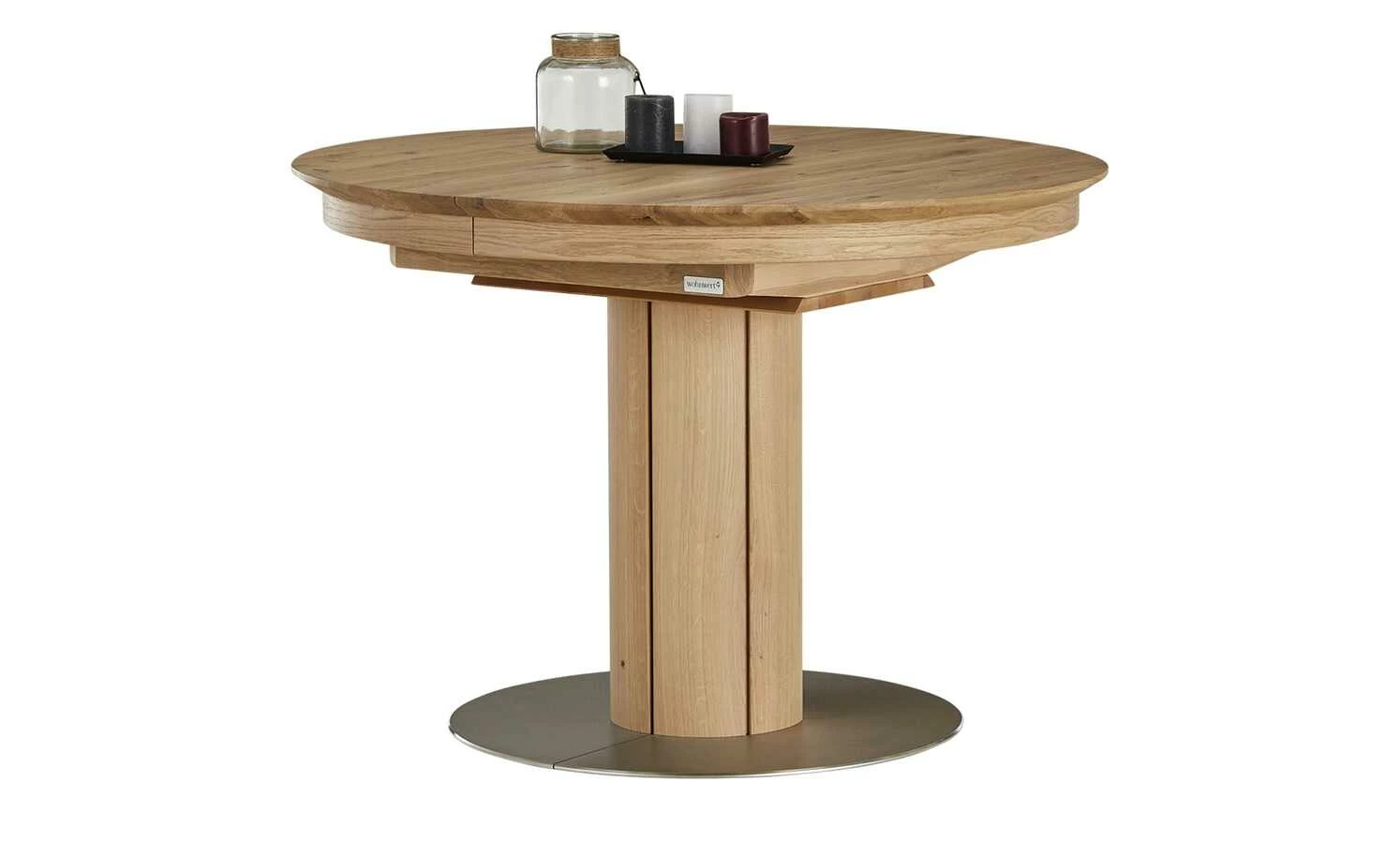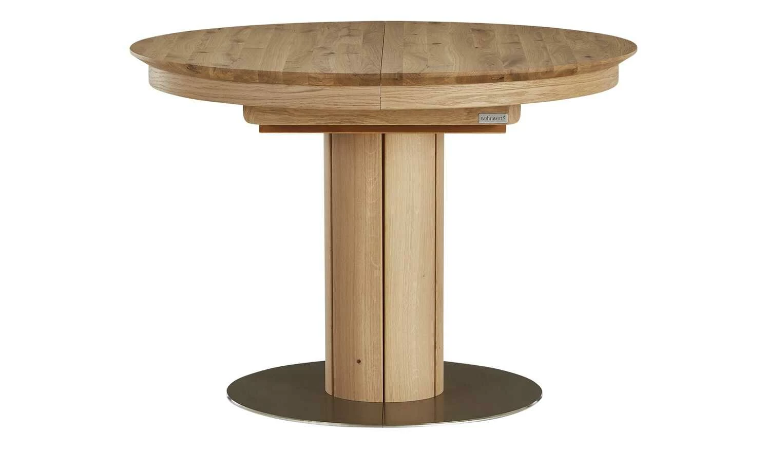 Beim Esstisch Der Runde von Wohnwert ist der Name Programm. Er verfügt über eine große runde Tischplatte. Sie kann aber mit wenigen Handgriffen länglich werden. Möglich wird das durch den praktischen Mittelauszug mit 40 bzw. 45 Zentimeter Klappeinlage. Etwa vier bis sechs Personen können an dem Tisch Platznehmen. Tischplatte und Gestell bestehen aus Eiche Bianco, die mit einem Wachseffektlack behandelt wurde. Die Bodenplatte aus Edelstahl setzt Akzente und sorgt – zusammen mit dem Säulengestell – für einen guten Stand.