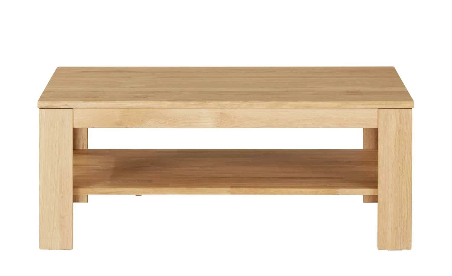 Durch sein schön gemasertes, helles Eichenmassivholz wirkt dieser Couchtisch natürlich und freundlich. Ergänzen Sie mit ihm Ihr Sofa oder Ihre Sitzgruppe und schaffen Sie Platz für Kaffee und Kuchen. Die 111 x 66 Zentimeter große Tischplatte und die darunterliegende Ablageplatte sorgen für praktischen Stauraum. Hier finden Fernbedienungen, Magazine und andere Dinge problemlos Platz.